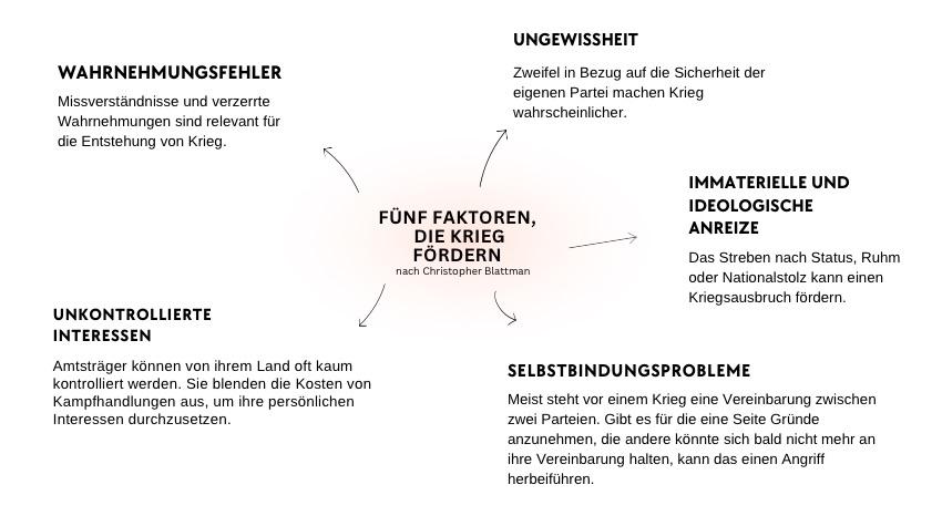 Die Ursachen eines Kriegs sind vielschichtig und komplex, das soll nicht bestritten werden. Doch in den meisten Fällen stehen politische Ziele im Vordergrund. „Der Krieg ist eine bloße Fortsetzung der Politik mit anderen Mitteln” formulierte es der preußische General Carl von Clausewitz 1832. Militärische Angriffe sind oftmals nur Mittel zum Zweck, um beispielsweise Machtstreben und ideologische Ziele von Regierungen zu erfüllen oder frühere Niederlagen zu rächen. Und wie lässt sich eine Gesellschaft überzeugen, ihr Leben für fremde Interessen aufs Spiel zu setzen? Die Präambel der UNESCO beschreibt, dass Kriege im Geist der Menschen entstehen. Das machen sich Herrschende, wie zum Beispiel Putin, zunutze um ihren Willen durchzusetzen. Durch die Verbreitung von Narrativen und Ideologien über verschiedene Kanäle lassen sie Bevölkerungen glauben, gewaltsame Verteidigung sei der letzte und richtige Ausweg. Dabei spielt Angsterzeugung eine wichtige Rolle. Menschen sind bereit zu kämpfen, wenn sie sich einem bedrohlichen Gegner gegenübergestellt sehen, also muss das Bild eines solchen gezeichnet werden. Mit der Zeit kann die Furcht in Wut und Hass umschlagen, was den Kriegstreibern zugutekommt.