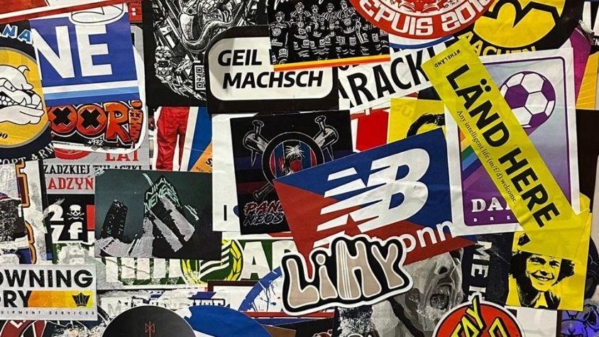 Die quietschgelben „THE LÄND“-Aufkleber fallen sogar in einer Flut an Stickern auf. | Quelle: Lina Preiß