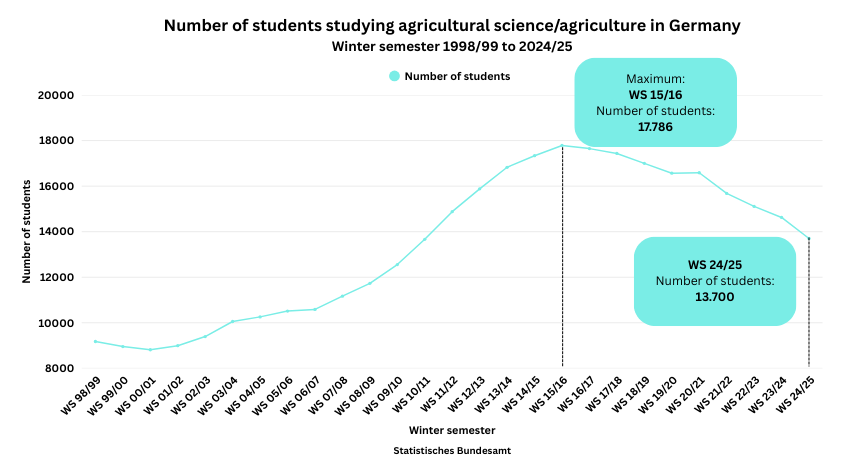Statistics show that the number of agricultural science students in Germany has risen since 1998/1999, peaking in 2016 with almost 18,000 students. Since then, however, these numbers have been declining. In the winter semester of 2024/2025, the number of enrolled students was only 13,700.