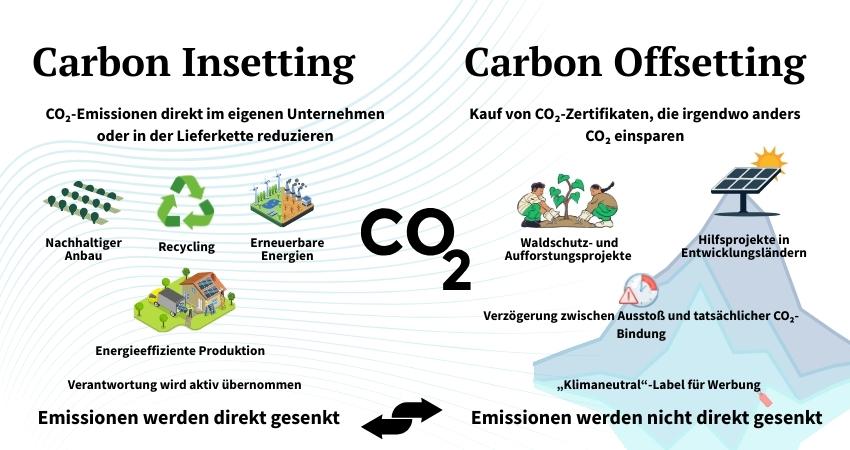 Im kompletten Gegensatz dazu steht Carbon Insetting. Während beim Carbon Offsetting Zertifikate gekauft werden, um die entstandenen Emissionen irgendwo auszugleichen, setzt Carbon Insetting innerhalb der eigenen Lieferkette an. So werden beispielsweise Produktionsanlagen effizienter, Lieferanten stellen ihre Plantagen auf nachhaltige Methoden um, Materialien werden recycelt oder Firmen installieren Solar- oder Windanlagen auf ihrem Gelände. Die Wirkung von Carbon Insetting ist zwar geringer: Die Verbesserungen sind kleiner, wirken aber genau dort, wo sie entstehen. So können Unternehmen Verantwortung übernehmen und Emissionen direkt im eigenen Wirkungsradius reduzieren, anstatt sie durch Bezahlung an anderen Orten kompensieren zu lassen. Auch wenn durch Carbon Insetting nicht alle Emissionen kompensiert werden können, macht es Einsparungen authentischer und sichtbarer.